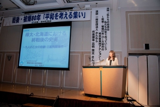 第二部講演として、情報労連北海道協議会の中川裕美子事務局次長より、樺太・北海道における終戦後の史実として、南樺太の真岡郵便局で起きた若い女性電話交換手たちの集団自決事件や、樺太からの引き揚げ者を乗せた3隻の船がソ連の潜水艦に攻撃され多数の犠牲者を出した事件について説明がされた。中川さんは参加者に向け「恒久平和の実現というのは、今生きている我々にしかできないことであり、我々の使命。平和は当たり前ではなく、自分たちで作り、育てていかなければならない。本日をきっかけに、ご家族や職場の方々と一緒に平和について考えていただきたい。」と呼びかけ、講演を締めくくった。