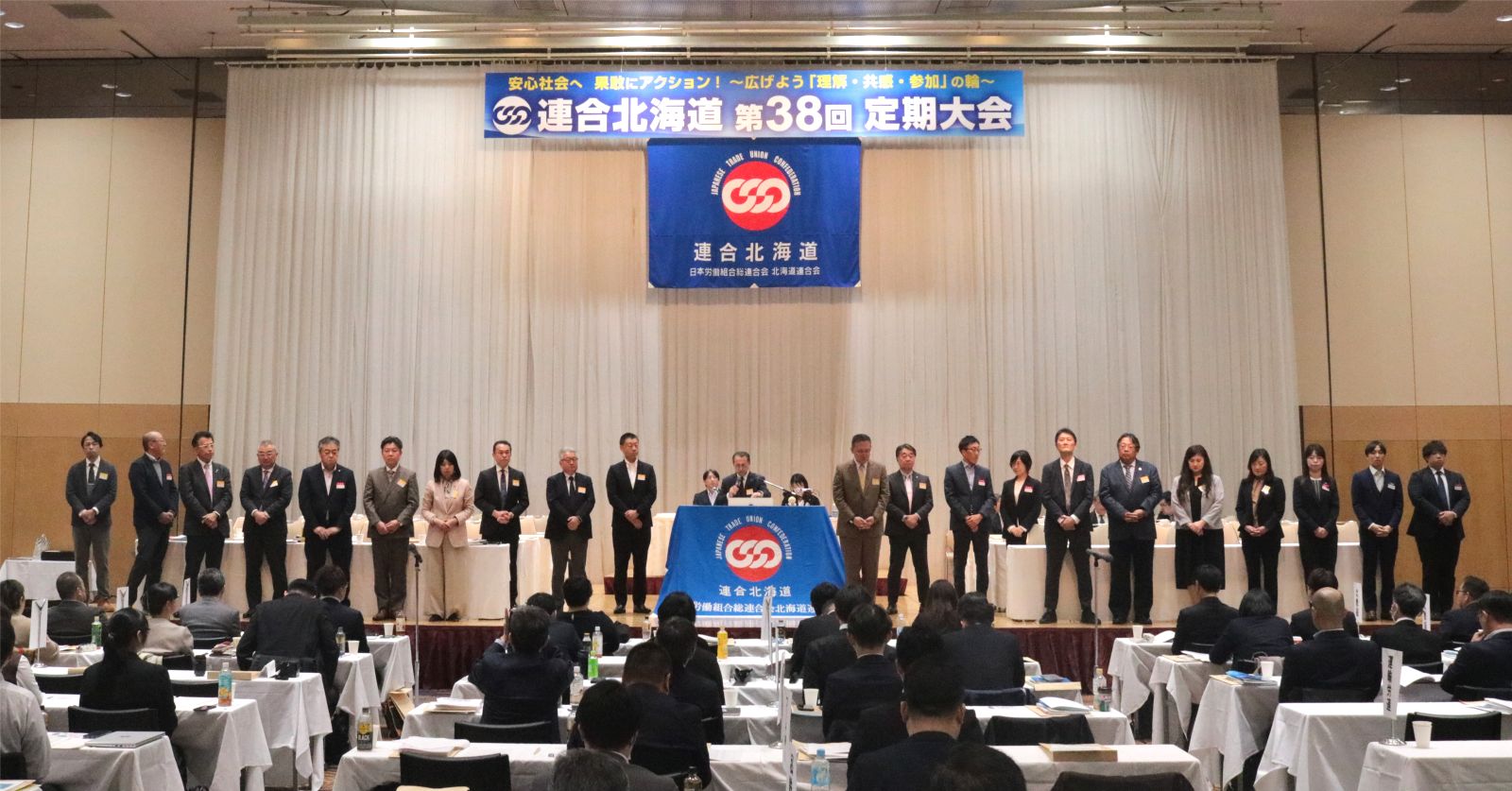 最後に、新執行部を代表して挨拶に立った須間会長は「加速度的に人口減少、少子高齢化、過疎化が進む北海道で、私たち働くもの、生活者にとって安心して暮らす環境がますます困難になることが想定される。職場と地域の課題は関係している。職場で働く私たちが安心して働けなければ地域も活性化はされない。連合として果たす役割はますます大きくなるが一丸となって取り組みを前進させる」と決意を述べた。