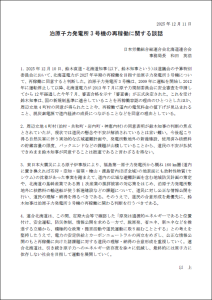 1.2025年12月10日、鈴木直道・北海道知事(以下、鈴木知事という)は道議会の予算特別委員会において、北海道電力が2027年早期の再稼働を目指す泊原子力発電所3号機について、再稼働に同意すると判断した。泊原子力発電所3号機は、2009年に運転を開始し2012年に運転停止して以降、北海道電力が2013年7月に原子力規制委員会に安全審査を申請してから12年経過した今年7月、審査合格を示す「審査書」が正式決定された。これを受け鈴木知事は、国の新規制基準に適合していることを再稼働容認の理由のひとつとしたほか、周辺立地4町村の同意が得られたことや、再稼働で道内の電気料金の値下げが見込まれること、脱炭素電源で道内経済の成長につながることなどを同意の理由としている。