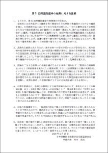 - 今後の政権運営では、一強多弱の国会で様々な政策が与党中心に推し進められることが予想される中で、憲法改正についての議論も加速することが懸念される。説明責任を果たしつつ少数意見にも耳を傾け、熟議により合意形成を図ることは民主主義の常道であり、そのうえで国民に丁寧に説明することこそがあるべき姿である。